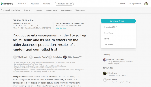 アーツアライブは2019年カナダのマギル大学教授のDr. Olivier Beauchetの呼びかけに応じて、「美術館における参加型アートプログラムへの参加が在宅高齢者のQOLやウェルビーイング、心身の健康に及ぼす影響についての比較ランダム国際治験 A-Health」を実施しました。 その治験の結果がこの度、Frontiers in Medicine 誌に発表されました。オープンアクセスなので、誰でも閲覧可能です。